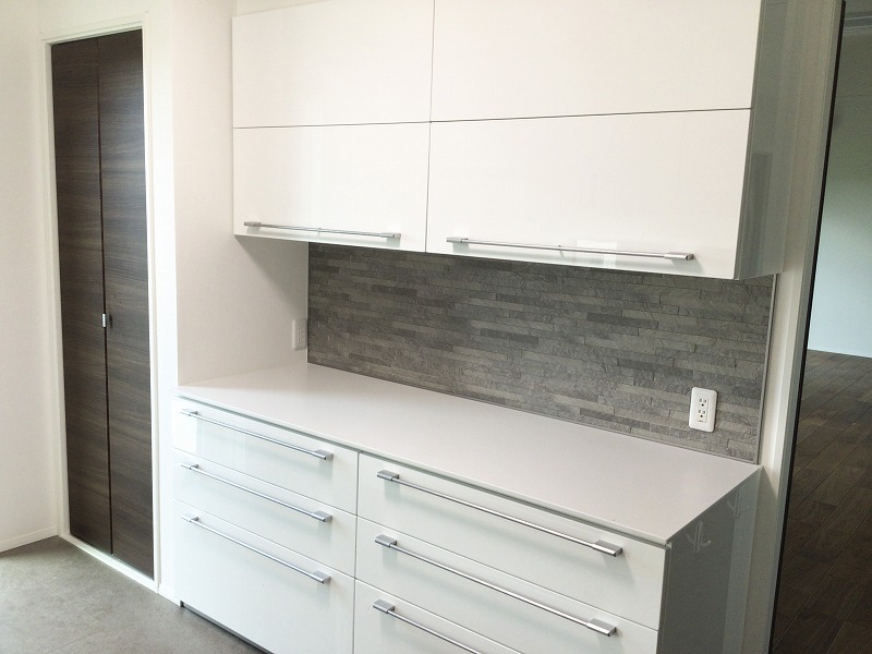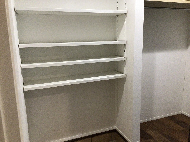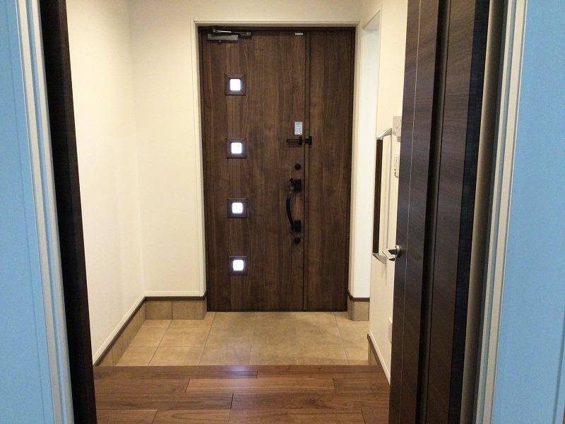 扉は左から、玄関、シューズクローク、ユーティリティ、洗面所、キッチンの順です