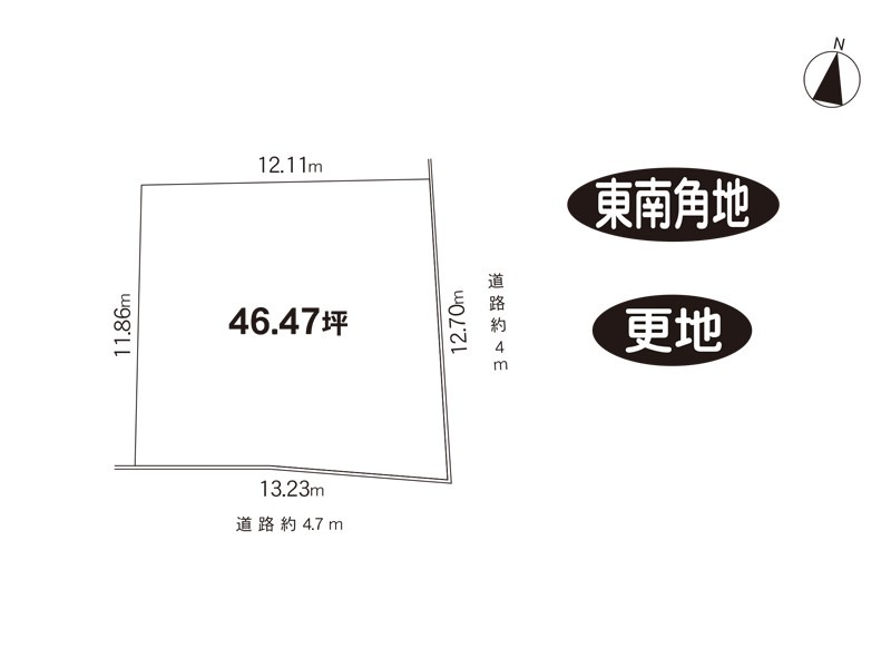 接道状況等 | ⼆⽅(⾓地) (南,約4.7m,公道)(東,約4m,公道) | ||
