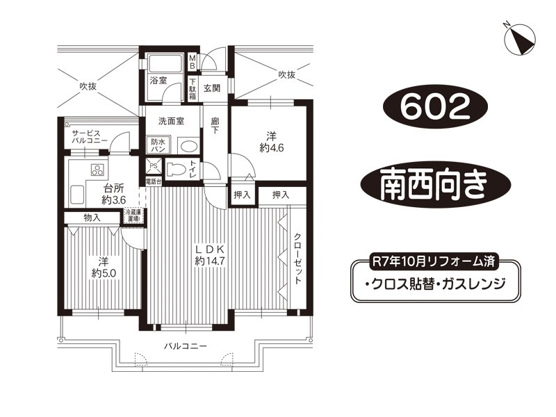 令和7年10月リフォーム済(クロス貼替、ガスレンジ)/南西向き