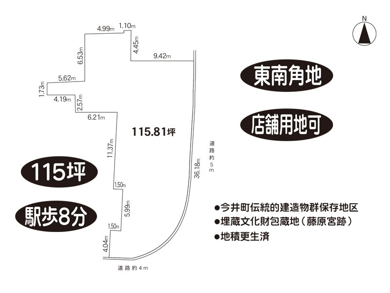 東南角地/店舗用地可/115坪/駅徒歩8分/地積更正済/今井町伝統的建造物群保存地区/埋蔵文化財包蔵地(藤原宮跡)