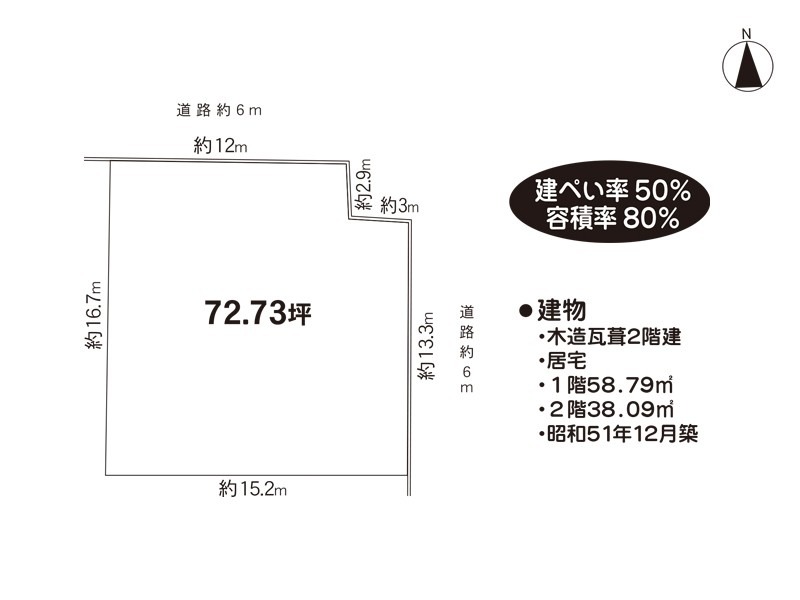備考:建物 木造瓦葺2階建 居宅(1F 58.79平米 2F 38.09平米) 昭和51年12月築