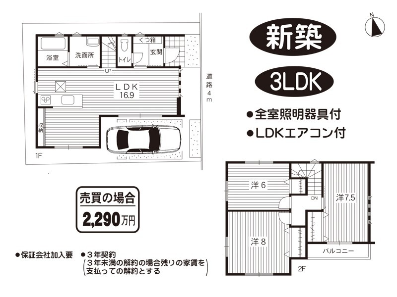 A号棟/3LDK/全室照明器具付/LDKエアコン付/保証会社加入要/3年契約(3年未満の解約の場合、残りの家賃を支払っての解約とする)