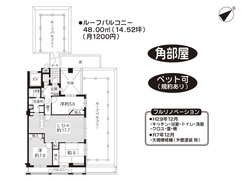 マンションの最上階の角部屋です/48平米のルーフバルコニー/平成29年12月リノベーション済(キッチン、浴室、トイレ、洗面、クロス、畳、襖)/令和7年12月大規模修繕実施(外壁塗装他)/ペット可(規約による制限有)バス停徒歩3分/徒歩圏内にコンビニ、スーパー、総合病院などがあります