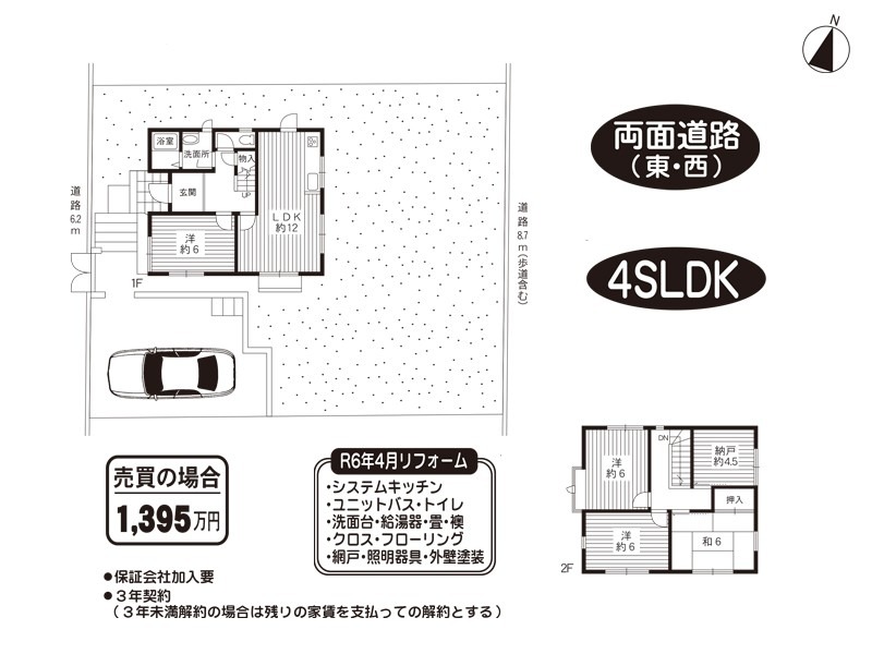 東西両面道路です/令和6年4月リフォーム済(システムキッチン、ユニットバス、トイレ、洗面台、給湯器、畳、襖、クロス、フローリング、網戸、照明器具)/4SLDK