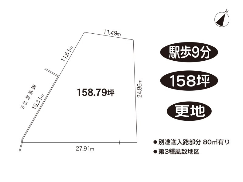 駅歩9分/158坪/更地/別途進入路部分80平米有/第3種風致地区