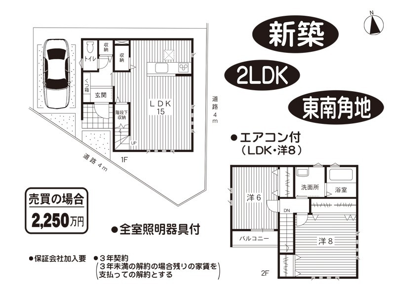 B号棟/新築/東南角家/2LDK/全室照明器具付/LDKと洋室8帖はエアコン付/保証会社加入要/3年契約(3年未満の解約の場合、残りの家賃を支払っての解約とする/