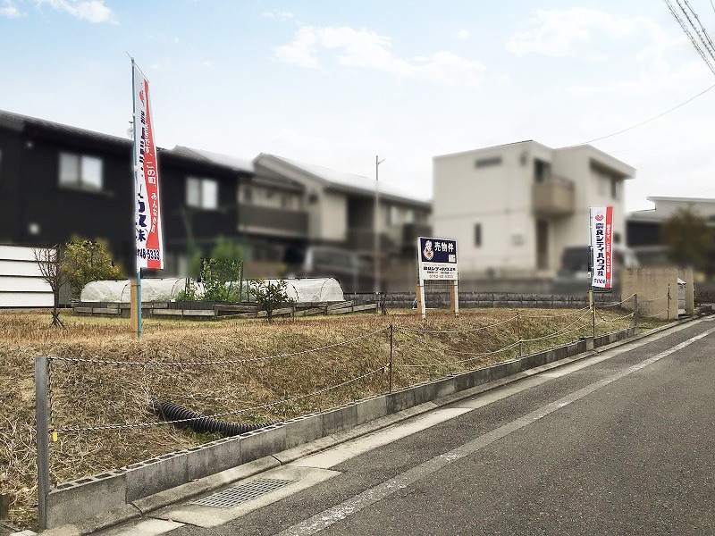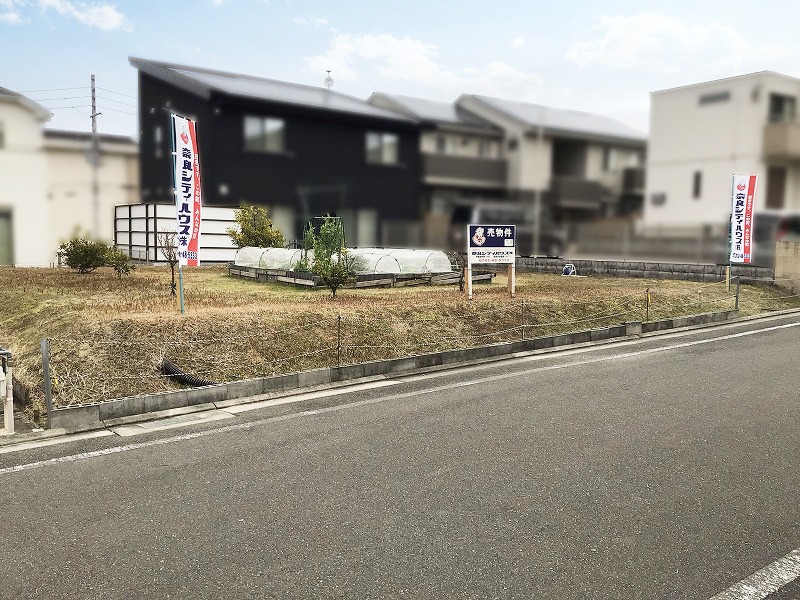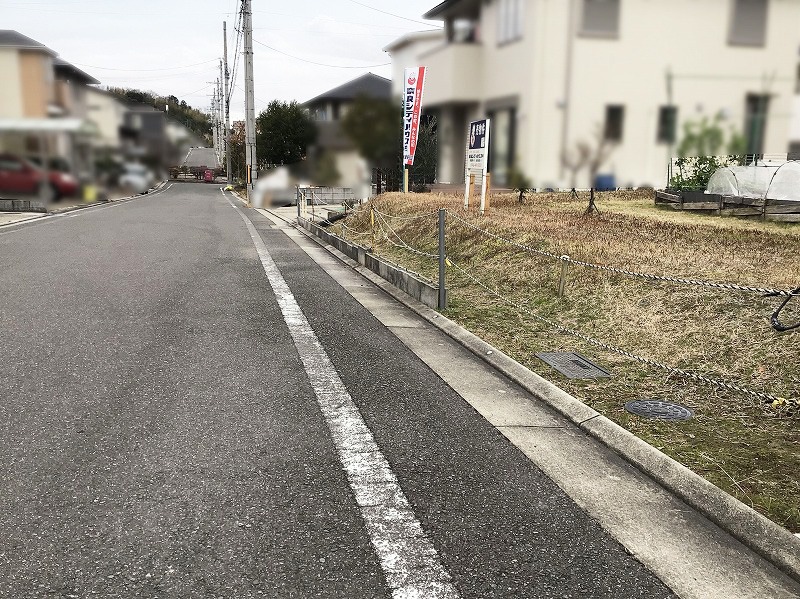 南道路に面した70坪の土地です/道路との段差が少ない整形地です/小学校へ430m、最寄りの公園へ60mです/国道163号線 城址公園交差点へ810mと車でのお出かけも便利です/建築条件がないので、お好きなハウスメーカーや建築プランを自由に選べます